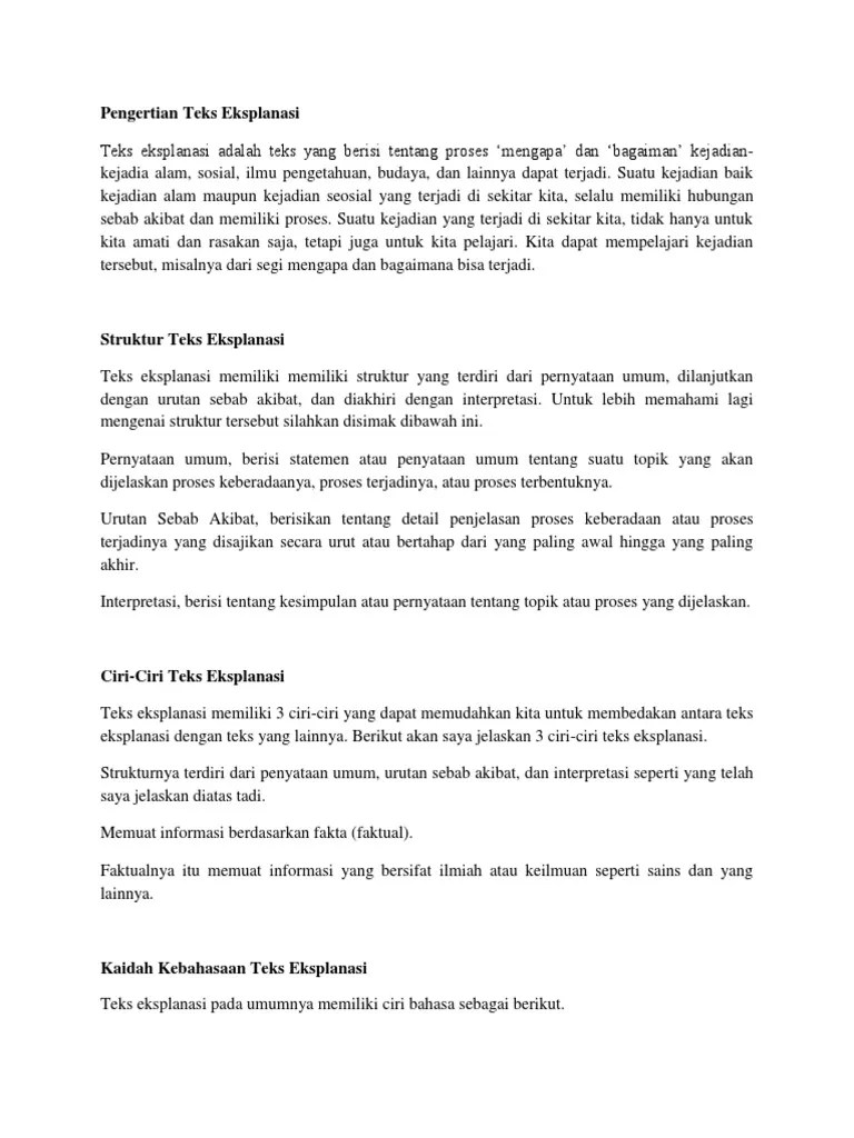 Salah Satu Ciri Teks Eksplanasi Adalah Bersifat Faktual Jelaskan Maksudnya : Teks Eksplanasi Pengertian Ciri Struktur Tujuan Skema Jenis Kaidah Manfaat Dan Contoh Kula Nuwun - Sama seperti teks yang lainnya, teks eksplanasi mempunyai beberapa ciri.